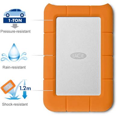 The LaCie Rugged Mini Hard Disk shares features with our popular Rugged Hard Disk, like shock resistance, drop resistance, and a rubber sleeve for added protection. But with the Rugged Mini, we've gone a step further: it's also rain-resistant, and pressure-resistant-you can drive over it with a 1-ton car, and it still works! Its small size makes it perfect to take with you wherever you go, and its Rugged exterior provides protection against accidental drops, shock, or pressure.