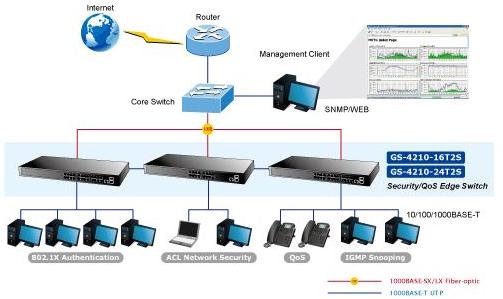 To build a network solution of FTTH (Fiber to the Home) or FTTC (Fiber to the Curb) for ISPs, and FTTB (Fiber to the Building) for enterprises, the various distances of SFP and Bidi (WDM) transceivers are optional for customers’ choices. For security and various applications, the 24 Gigabit ports of the GS-4210-24T2S can be configured with VLAN settings and connected to different units, offices, floors, houses and departments.