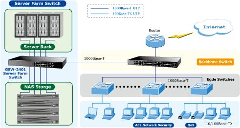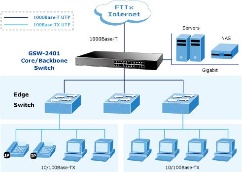 topAll RJ-45 copper interfaces of the GSW-2401 support 10/100/1000Mbps auto-negotiation for optimal speed detection through RJ-45 Category 6, 5 or 5e cables. It also supports standard for auto-MDI/MDI-X that can detect the type of connection to any Ethernet device without requiring special straight or crossover cables.